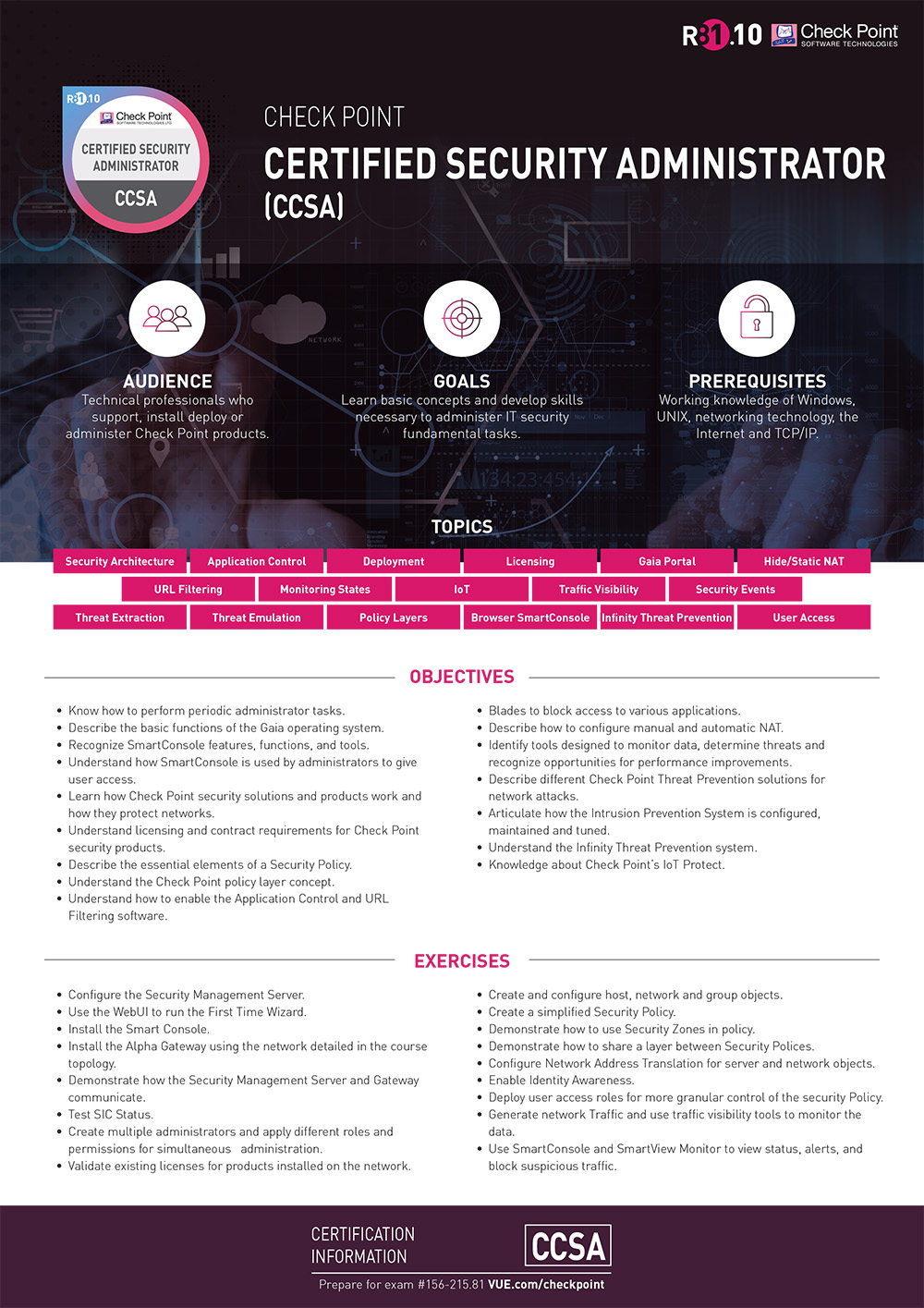 Check Point güvenlik duvarı ve yönetim sunucularının kurulum , yapılandırma ve günlük operasyonlarını kapsayan 3 günlük bir eğitim olan CCSA aşağıdaki temel konuları kapsamaktadır.