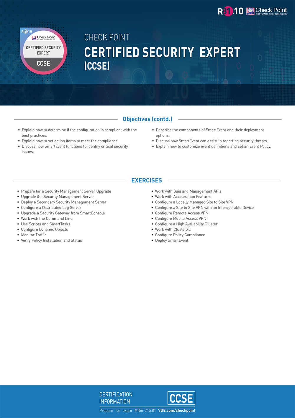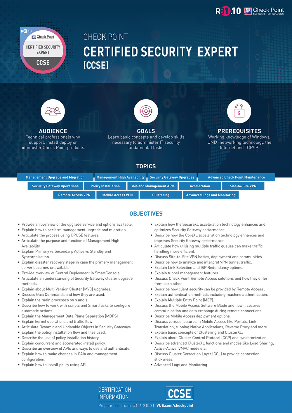 Check Point güvenlik sistemlerinin yapılandırılması , düzenlenmesi ve sorun giderme aşamaları ile birlikte VPN optimizasyonu ve yönetim sunucusu güncellemelerini kapsayan 3 günlük bir eğitimdir.